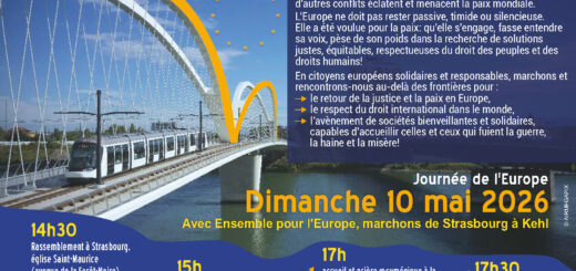 La guerre qui endeuille l’Europe se poursuit, les tensions et les affrontements se multiplient dans le monde. L’Europe est plus que jamais nécessaire : unie, solidaire, résolument engagée sur le chemin de la paix. Que des voix se lèvent au sein de la société civile, que les députés européens prennent des initiatives, que les Etats membres se souviennent que dès ses origines l’Europe a été voulue pour assurer un avenir de paix à ses habitants. Marchons et rencontrons-nous au-delà des frontières pour : le retour de la justice et la paix en Europe, le respect du droit international dans le monde, l’avènement de sociétés bienveillantes et solidaires, capables d’accueillir celles et ceux qui fuient la guerre, la haine et la misère !